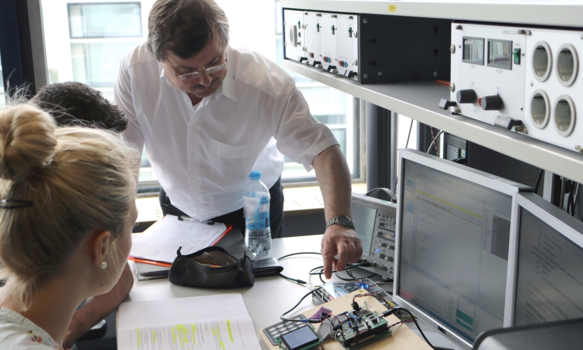 The laboratory is equipped with 12 laboratory bench workstations. Each table has an evaluation board (experimental electronics assembly) for the microcomputer technology and digital technology practical courses. For the microcomputer technology an assembly with an ARM based microcontroller from STM and a graphic LCD with touch screen is used. For the digital technology an FPGA board from Altera is used.