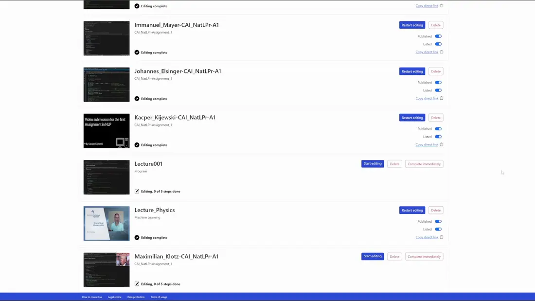 The system has generated the summary, the transcript, as well as all the other data. You can (and should!) review it by clicking the “start editing” button – this will present to you the generated content to review and edit, step by step. After you are done, in the same list you will see two toggles – “published” and “listed”. To share the video with the students you should usually just activated them both – after that the students will be able to search for your videos and find them in all the relevant areas.