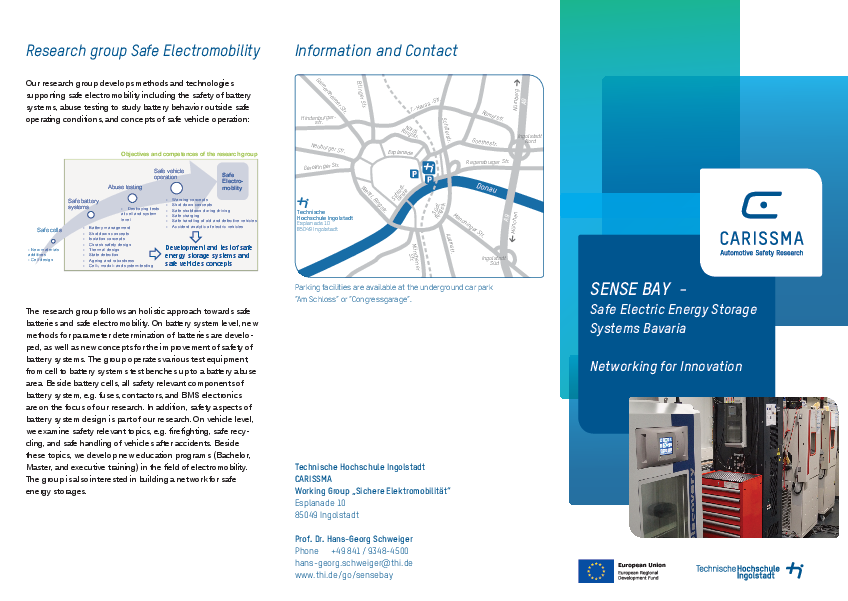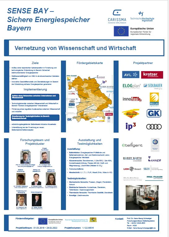 The project SENSE BAY - Safe Energy Storage Bavaria is supported by the European Regional Development Fund (EFRE). Project duration: 01.03.2018 - 28.02.2022, Project volume: 1.122.805 €.