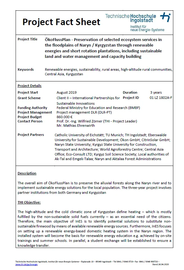 The Institute of new Energy Systems (InES) at Ingolstadt University of Applied Sciences (THI) is responsible for work package 5 (renewable energies) in the ÖkoFlussPlan project. The main objective of this work package is to find feasible solutions for the integration of renewable energies in rural Kyrgyzstan. In addition to the planned scope of the ÖkoFlussPlan project, the of a community house, called "Real Lab", was constructed to demonstrate the use of sustainable energy solutions.