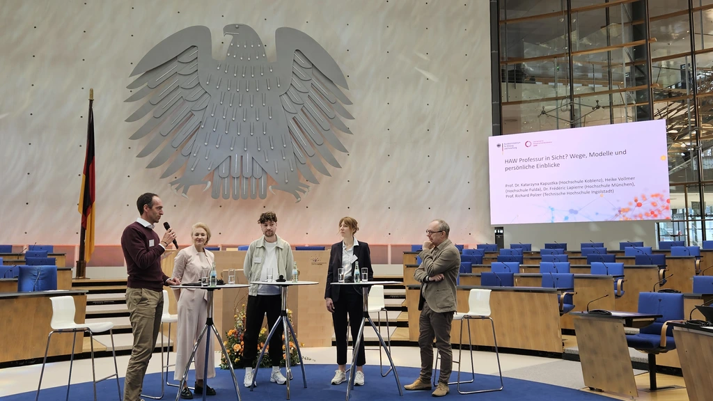 THI-Nachwuchsprofessor Richard Polzer diskutierte in einer Podiumsrunde über Karrierewege zur Professur. Zudem stellte die THI ihr innovatives Professional Tenure Track-Programm vor, das Lehre und Praxis bzw. Promotion im Rahmen der Nachwuchsprofessur kombiniert.